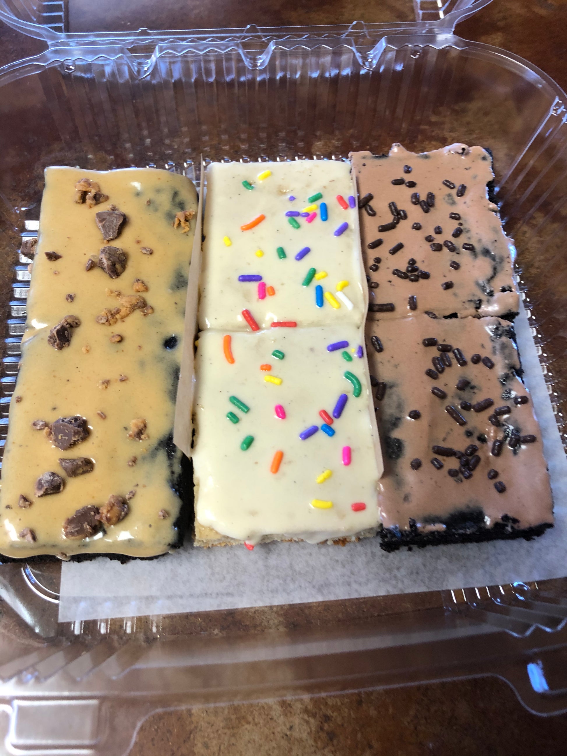 Choose from brownie or blondie style bars topped with your choice of a crunchy chocolate protein hard shell or made creamy protein frosting.